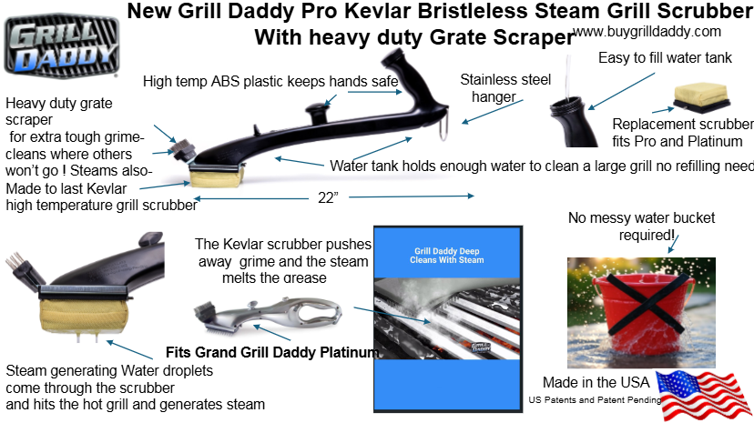 Upgrade your grill-cleaning routine with the Bristleless Grill Daddy Pro BBQ Steam Kevlar grill Scrubber with Grate Scraper—made in the USA. Designed for durability, safety, and efficiency, this innovative tool harnesses the power of steam to break down tough grease and grime . Built to handle the toughest messes, this bristleless cleaning solution combines power, durability,